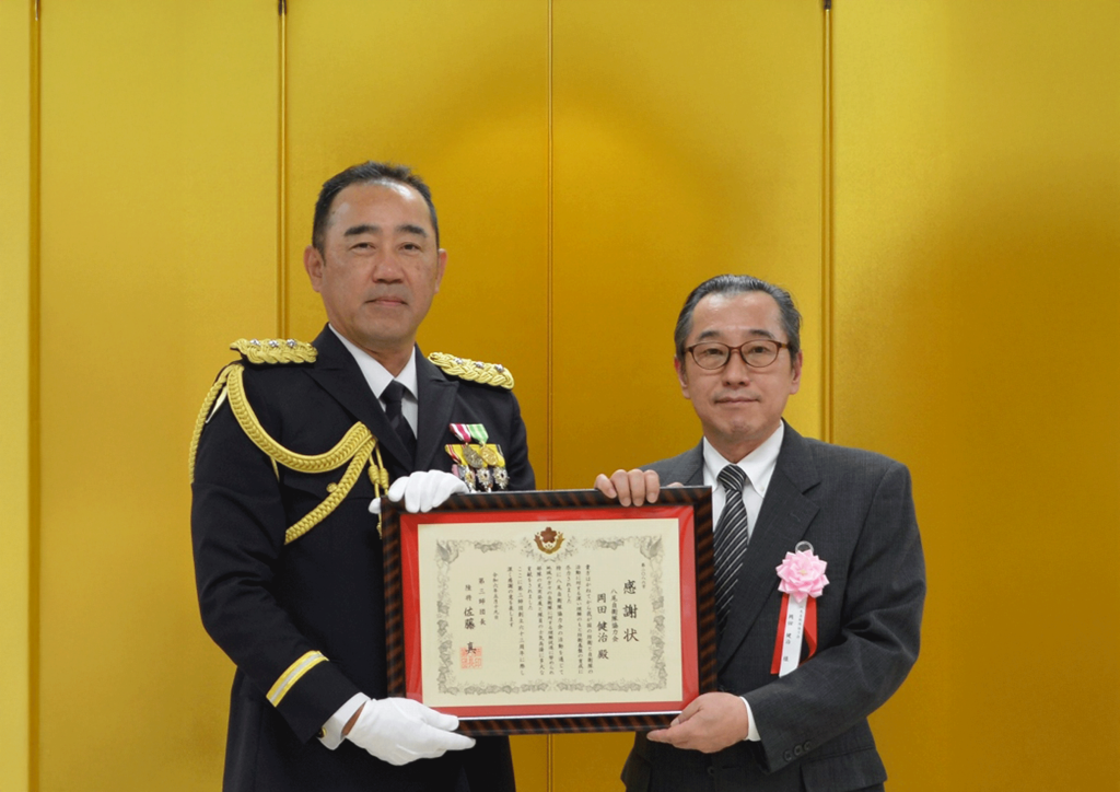 八尾自衛隊協力会の活動を通じて、自衛隊に対する理解の促進、八尾駐屯地の充実発展、隊員の士気高揚に多大な貢献により、第3師団長より感謝状を授与される、協力会理事の岡田健治さん