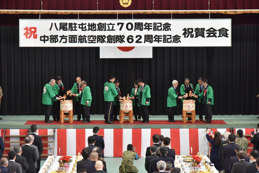 祝賀会食の開始に際し、鏡割りを実施する様子