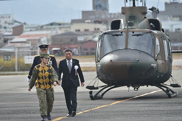 八尾駐屯地創立70周年(中部方面航空隊創隊62周年)の祝賀セレモニー開始にあたり、着陸した多用途ヘリコプターUH-2から登場する協力会会長と八尾駐屯地司令
