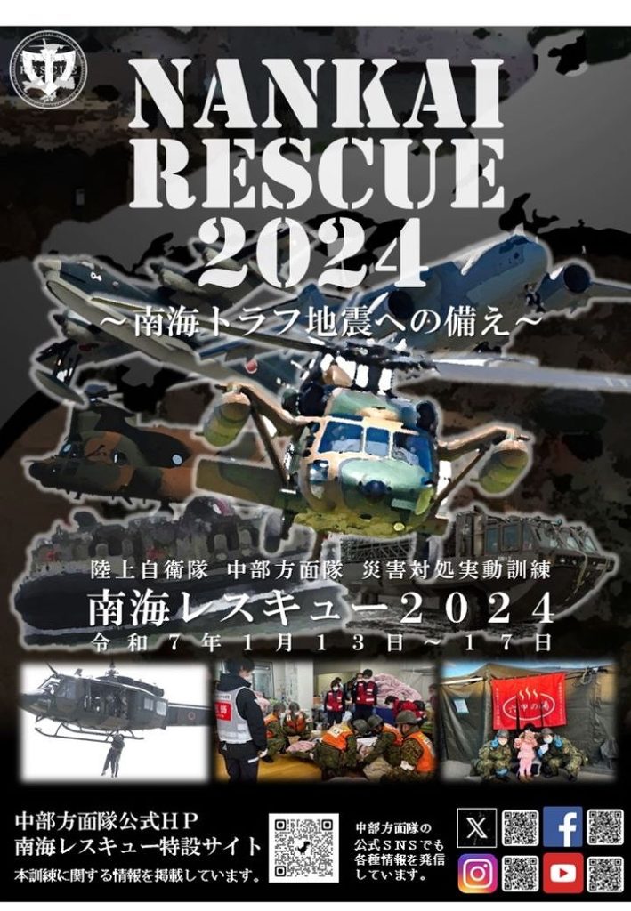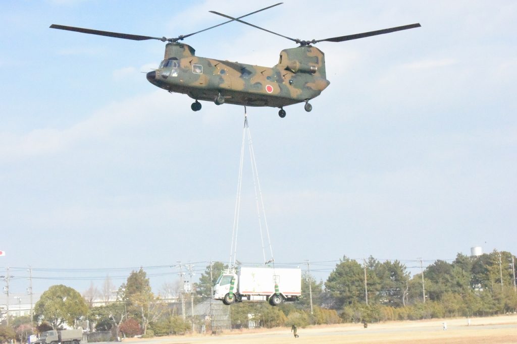 令和7年1月14日〜17日 南海トラフ地震の発生を見据えた防災訓練(南海レスキュー)に参加し中部電力の発電車を吊り上げる輸送ヘリコプターCH-47